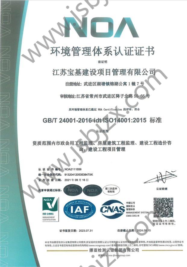 环境管理体系认证证书