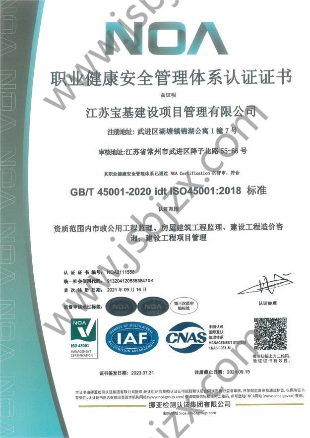职业健康安全管理体系认证证书